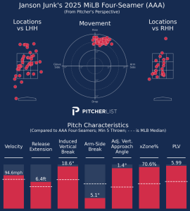 Right-handed pitcher Janson Junk is hardly what you would consider a prospect, but heading to the Miami Marlins‘ pitching lab may be what the 29-year-old needed to revitalize his MLB career. Currently in the Jacksonville Jumbo Shrimp rotation, Junk has proved his fastball is anything but his last name, increasing his career averages in nearly every aspect. The average velocity is nearly exactly the same, but more iVB, better HAVAA, and better extension give the pitch plenty of life. The control is still a work in progress, but keep an eye on him returning to the bigs in 2025.