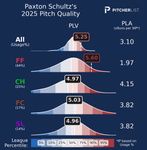 Though he’s been a starter as recently as 2022, Schultz settled into a long-man role in Buffalo before earning this call-up. Even if this outing turns out to be a one-off, he showed real upside: his four-seam fastball checked in at a 5.60 PLV (an elite mark), and he threw it with only a 3.6% mistake rate. Overall, Schultz generated an absurd 85.7% strike rate and a 53.6% CSW%, leaning heavily on that heater nearly half the time. His cutter (54.5% CSW) and slider (66.7% CSW) kept Mariners hitters off-balance, too. Toronto fell 8–3, but they may have unearthed a valuable bulk-relief option—just the kind of depth the rotation needs if Max Scherzer isn’t ready to return to the mound.