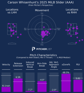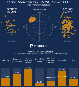 Whisenhunt entered the year armed with perhaps the best changeup in the minors. His 5.98 PLV on the pitch is absurd for Triple-A, and it alone gives him a ticket to The Show. He disguises the tumbling 78–81 mph offering with identical arm speed to his heater, then tweaks its depth and shape to keep hitters honest. He pairs it with a two-seam fastball that sits 92–94 MPH—topping out at 96—with plus vertical break. Unfortunately, opposing hitters have taken advantage, teeing off on the pitch this season despite those plus metrics.