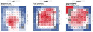 Referring back to the bat tracking table, Kurtz displays one of the deepest contact points in the league, with an average intercept point of 25.7 inches away from his center of mass. In a vacuum, most power production lives out in front of the plate with a contact point closer to the pitcher, as swings have more time to accelerate, create bat speed, and generate pulled fly balls; however, a deeper contact point might be ideal for Kurtz, given his existing plus bat speed. Combining a high attack angle with a deep contact point indicates that Kurtz is likely able to accelerate well throughout his swing, allowing him, in theory, more time to make a decision whether or not to swing at a given pitch, while still being able to make optimal contact.