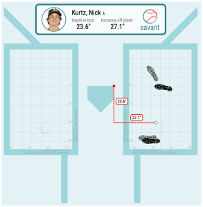 In Kurtz’s FanGraphs preseason scouting report, Eric Logenhagen wrote, “Despite his size, Kurtz is a short-levered guy. His front arm basically bars as he loads his hands, but his T-Rex levers help keep his swing from getting too long. He has terrific vertical plate coverage and is a threat to do damage all over the zone. Big league pitchers are likely to attack Kurtz on the outer third with fastballs and changeups, which his short levers/open stride combo sometimes cause him to swing inside”. This portion of his evaluation has proven to be prophetic, as shown by the heat maps above, Kurtz has frequently been thrown pitches low-and-away during the beginning of his Major League career, and Kurtz has experienced difficulty making contact against these offerings. As visualized by Statcast’s batting stance data, Kurtz has displayed an open stride so far this season, allowing him to effectively turn on pitches located on the inner-third of the plate, but leaving him vulnerable to swing-and-miss on pitches located on the outer-third.