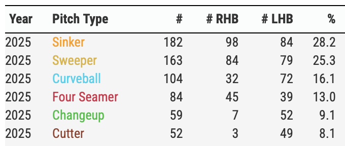 Until his current pitch strategies stop working, I don’t think there’s much to be gained by messing with those either. His current plan is as follows: Throw the sinker low in the zone and in on righties, force hitters to fight the sweeper in the zone, high 4-seams, curveballs for whiffs, especially against lefties, low changeups, and high to glove side cutters, both exclusively to lefties. I guess he could try to specialize a bit more and throw more 4-seams and fewer sinkers against opposite-handed hitters, but why tinker with something that’s working? Maybe reduce the curveballs a bit until the handle improves? I’m nitpicking at this point.