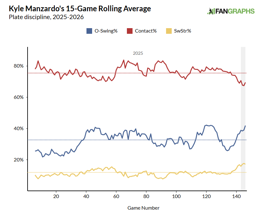 Manzardo’s O-Swing%, Contact%, and Swinging Strike% have all gone in negative directions.