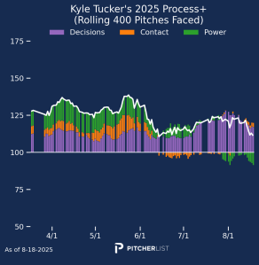 As you can see in the rolling 400-pitch Process+ chart above, when Tucker is going well, it’s because of his plus swing decisions, plus power, and slightly above average contact skills. While I’ve only included his rolling Process+ chart for this year here, he’s taken the same path to success in previous years too. But as of late, only the swing decisions have been propping him up. His barrel rate in the last 30 days is a minuscule 1.6%. In the past four years, there have only been about three months where Tucker’s rolling 400-pitch power output dipped below league average.