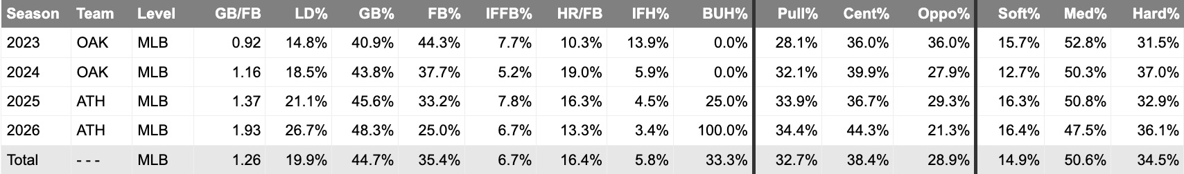 Verdict: Panic. There’s a lot to be concerned about here. I almost suspect he may have an injury he is dealing with. I don’t have much insight to provide, but he is a slugger who needs to hit the ball harder. If he doesn’t, 2026 will be the worst year of his career thus far. He has played a third of his game in cold-weather environments, so maybe he’ll loosen up.