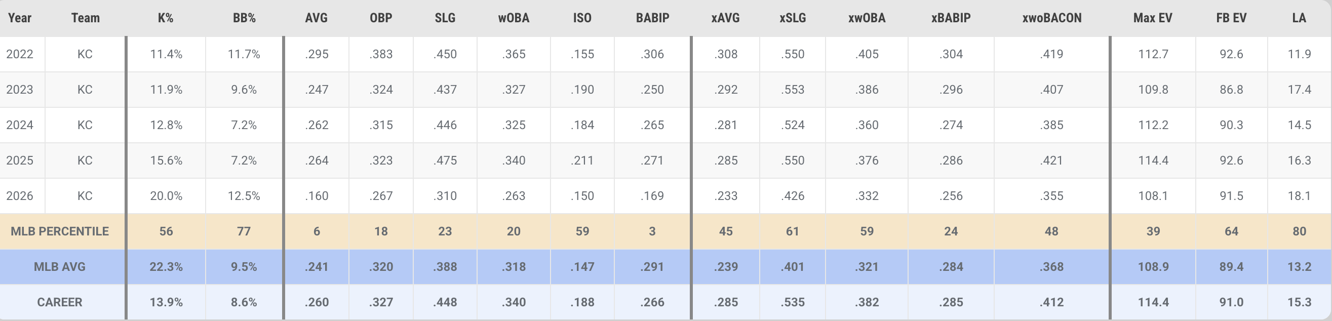 2026 has not been so good. His K% is up to 20.0% and his SLG is way down to .310. His .160 AVG and .267 OBP have contributed to a 58 wRC+. What’s going on?