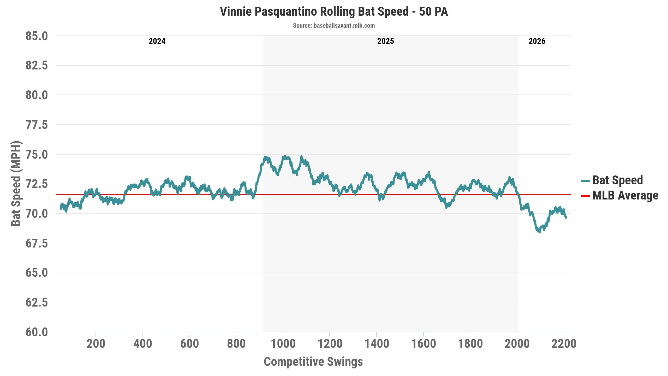 He has a .267 BABIP, which is a bit lower than his career, but within expected parameters. His Bat Speed is down 0.6 mph from last year, but that can be expected to increase a bit as it continues to warm up.