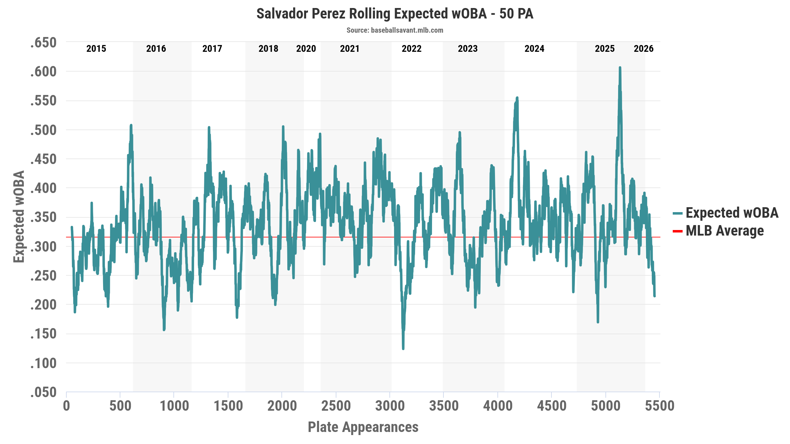 In his last 12 games, Salvador Perez is 8-for-51 with one home run and 16 strikeouts. He’s currently playing through some hip soreness, which hasn’t resulted in any time on the IL, but has forced the Royals to call up Elias Díaz to help man the plate and move Perez more frequently to DH. Perez turns 36 in May, so his body could be starting to break down. He’s started more games and caught more innings behind the plate than any other active catcher. Second on both lists, J.T. Realmuto, just turned 35 in March and has seen his fantasy stock drop dramatically in recent seasons.