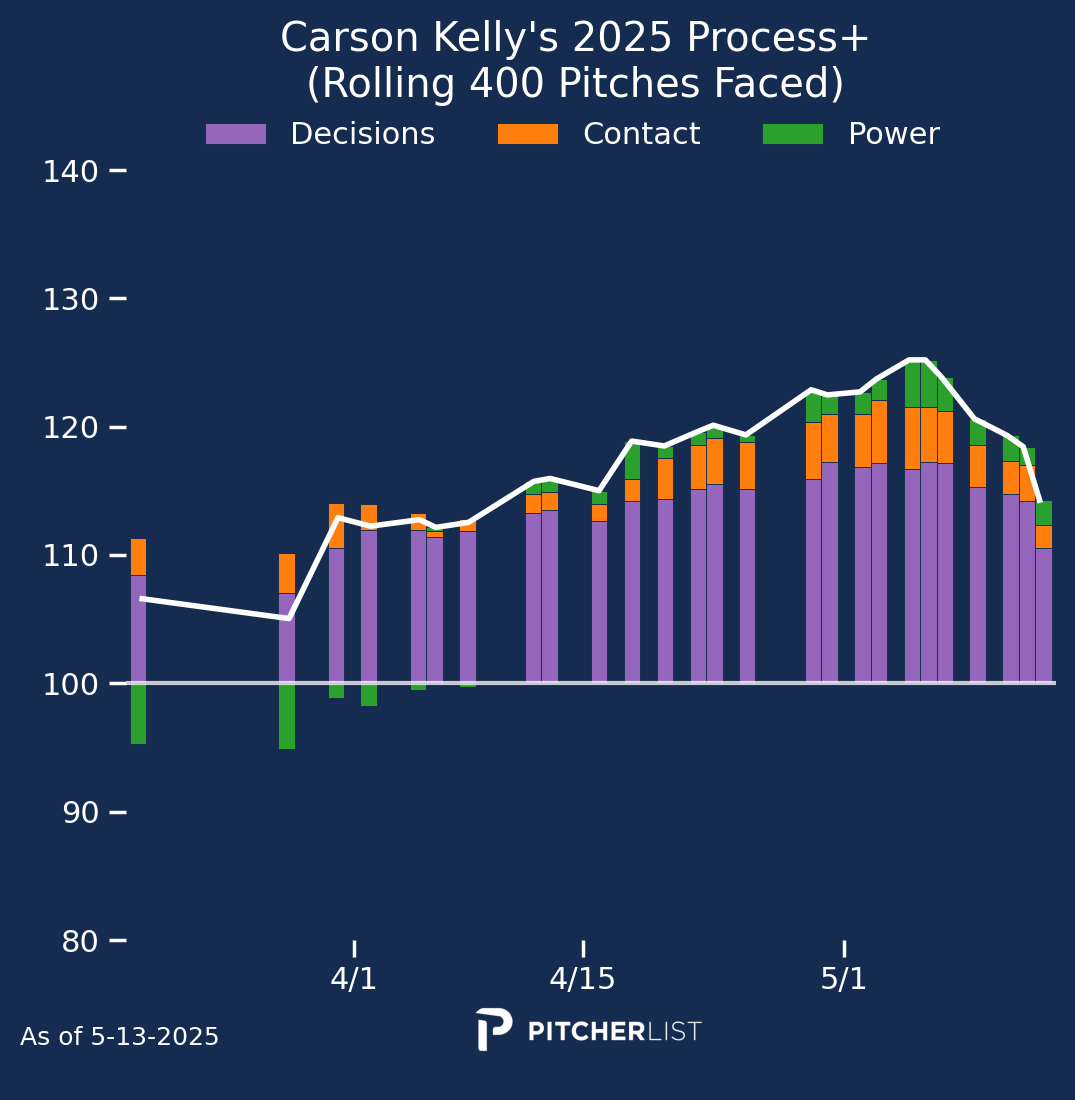 Kelly’s shown an elite ability to target pitches he can do damage with, and he ranks sixth on the Decision Value leaderboard. It’s just another step up in an area he’s been continually improving — he’s seen his Decision Value rise from 108 in 2023 to 120 in 2024 to 128 in his breakout 2025 season.