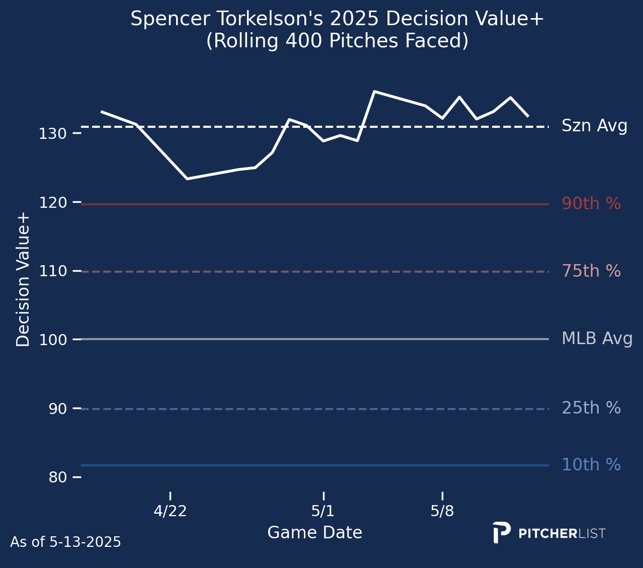 Decision Value gives Torkelson’s breakout even more legitimacy. His 133 mark is the fourth-highest among hitters who’ve seen at least 400 pitches (the threshold where Decision Value becomes more meaningful). That represents a significant improvement for Torkelson after he posted back-to-back seasons with a 113 Decision Value in 2023 and 2024.
