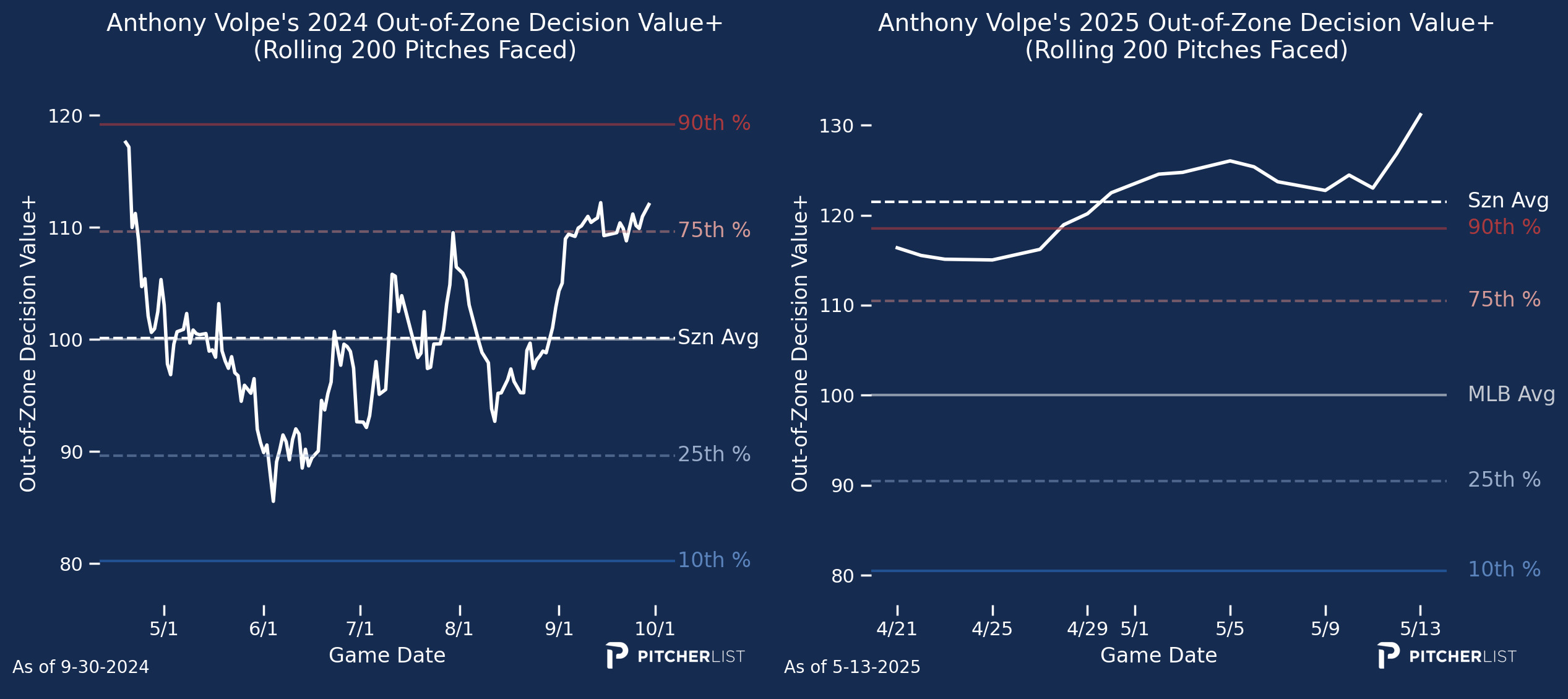 Volpe’s breakout goes far beyond surface-level stats; his .294 BABIP is actually down from last year’s mark. Volpe’s seeing everything better at the plate, bumping up his 105 Decision Value from 2024 to 122 in 2025. Where he’s really shined is picking up on pitches outside of the strike zone. His 123 oDV is the 16th highest in the majors, and as you’d expect, it’s been a boon to his walk rate. Volpe has nearly doubled his rate of free passes from 6.1% in 2024 to 12% in 2025.