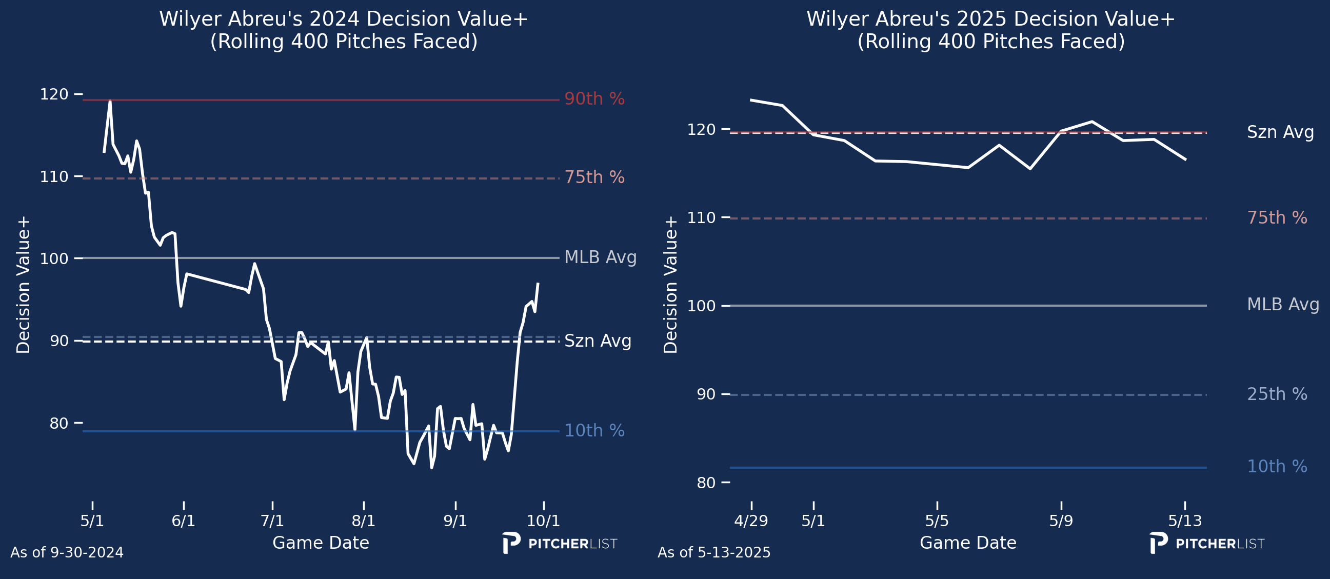 If you can find a metric, there’s a good chance that Abreu’s taken a step forward in it, and that includes Decision Value. He posted a below-average 94 Decision Value in 2024 and has raised it all the way to 121 in 2025. He’s been particularly good at identifying which pitches inside the strike zone he can do damage on. His 127 zDV is the sixth-highest in baseball.