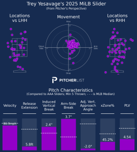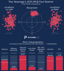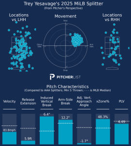 Yesavage leans heavily on the fastball, but has been balancing the rest of his throws between the splitter and a slider. The slider has a tighter spin and doesn’t generate much movement, but gives him a pitch in the 87 mph velocity band. It has been a more effective pitch for him than the fastball, so we could expect to see him throw it a bit more. Furthermore, he is listed as having thrown a cutter during his stint in the Florida League, but has not registered a single cutter in Triple-A. That cutter is very similar to the slider, such that they may be one and the same.