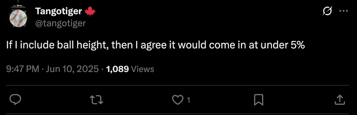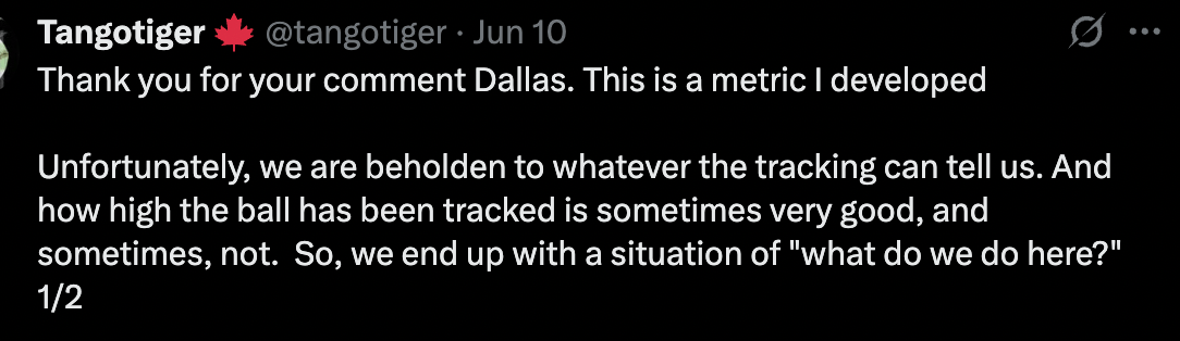 Statcast accounts for the fence getting in the way of an outfielder, but it doesn’t seem to account for how high a player might need to jump to execute a catch. There are reasons for this that developer Tom Tango has gotten into. When Athletics broadcaster and former player Dallas Braden complained on Twitter, Tango replied: