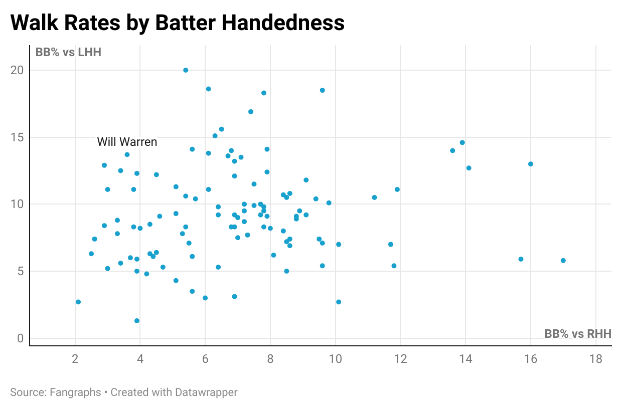 Warren is experiencing the expected growing pains in his first extended look as a big league starter. His splits are dramatic. He has been dominant against right-handed hitters, holding them to a .233 wOBA, but has struggled against lefties, who have produced a .358 wOBA.
