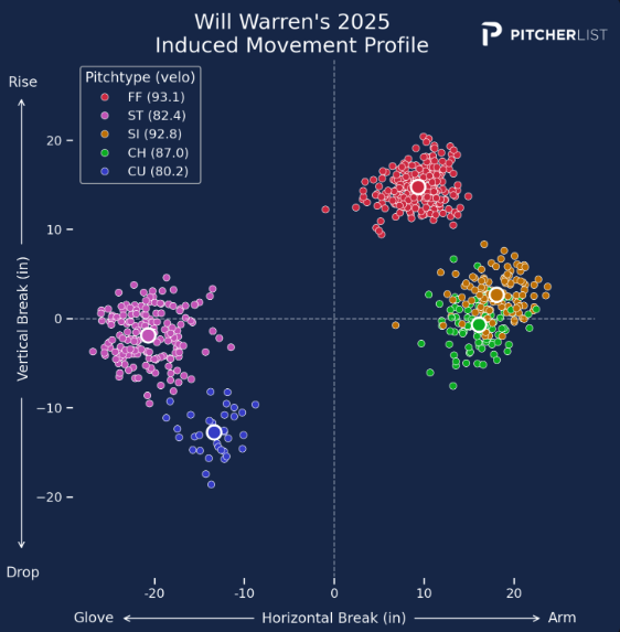 Warren’s four-seamer is unlikely to become a major weapon in his arsenal. With below-average velocity at 93.1 mph, its success will depend more on usage and pitch sequencing than overpowering hitters. However, his lower arm angle (26 degrees) adds a layer of uniqueness, helping differentiate it from more traditional four-seamers. The pitch shares traits with those of Brandon Pfaadt and Brady Singer, with Pfaadt specifically being an interesting comparison for Warren.