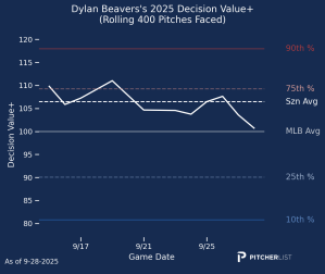 That’s not to say Beavers is flawless—he’s not as aggressive at the plate as he should be, getting into a 0-1 count 57.7% of the time last year in the majors. However, that’s something that can be learned, and given the guy is 24 and going this late in drafts, the potential is worth the price.
