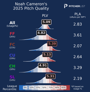 Cameron does have great secondary stuff. His cutter was the fifth-best in all of baseball last year by PLV and posted some killer numbers, including a 33% chase rate (78th percentile among cutters), a 34.5% ICR (71st percentile), and a 47.1% groundball rate.