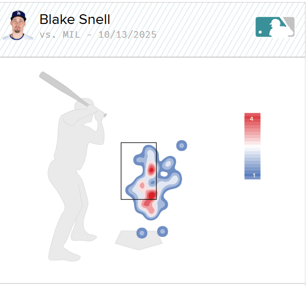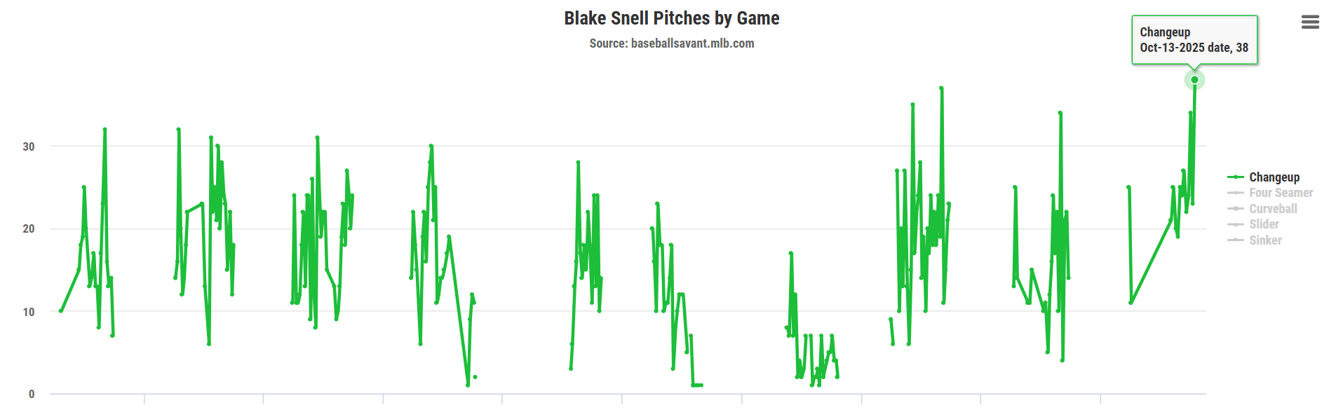 Snell has made a living on his fastball. It sits mid-high 90s, and he loves peppering the top of the zone with it thanks to a high arm angle. He throws it a lot, too, as it accounts for just under half the pitches he has ever thrown on a big-league mound. Something funny happened on Monday night in Milwaukee, though: Snell threw more changeups than he ever has in a start at the MLB level, regular season or postseason. The Brewers saw 38 changeups from him (all but three were to right-handers), topping his previous career-high of 37 from September 2023 when he was still with the Padres, and almost all 38 of them were absolutely filthy. The pitch registered an obscene 61% swing-and-miss rate in that outing, and only 44% of the swings it generated in the zone resulted in contact. Milwaukee put it in play five times, but only recorded an average exit velocity of 76 MPH. Somehow, the 14 whiffs Snell got with the changeup were not enough to match his career-high on that pitch…or even his season-high, as he got 15 on 34 changeups against the Reds back in Game 1 of the Wild Card Series.