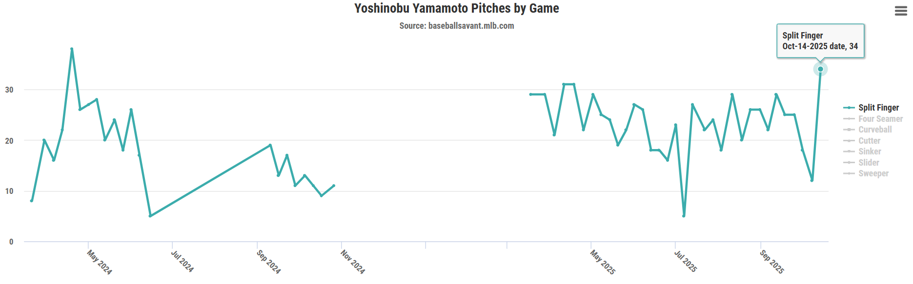 Yoshinobu Yamamoto splitters thrown by start, MLB career, regular season & postseason (Statcast)