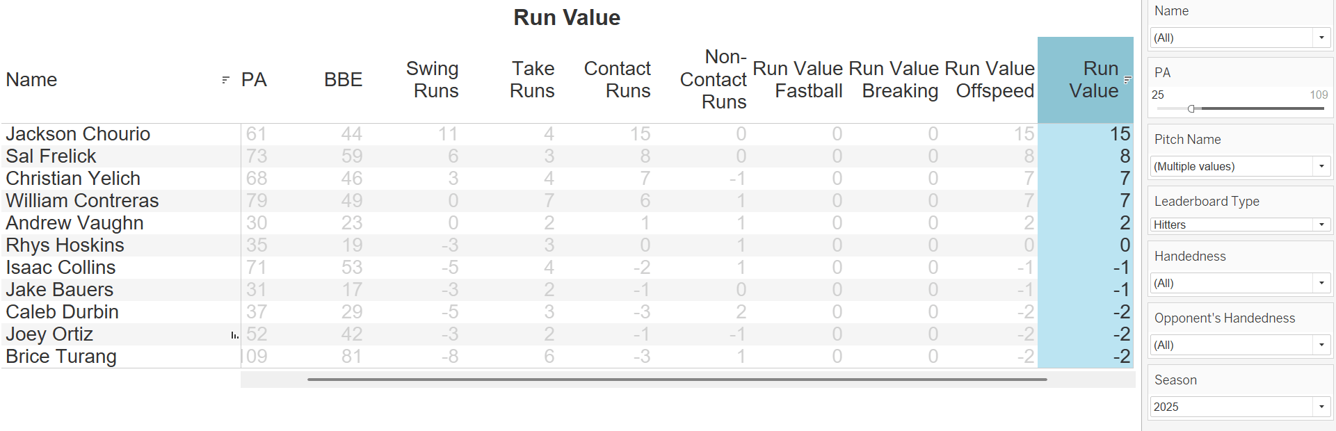Brewers hitters run value vs changeups and splitters, 2025, min. 25 PA (Statcast)