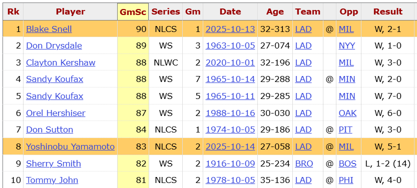 Top 10 postseason starts in L.A. Dodgers history by Game Score (Stathead)