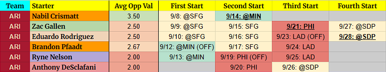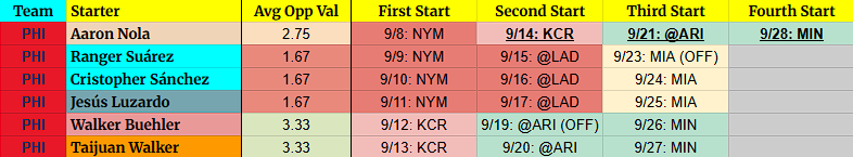 Ryne Nelson – He’s been solid and the developing slider curveball could take him another step forward before the end of the year. However, PHI + LAD should give you pause at the end of the season.