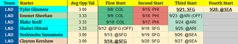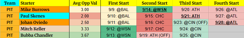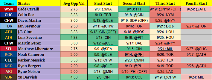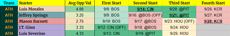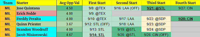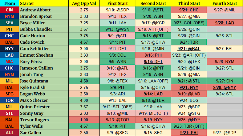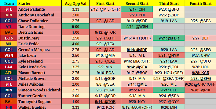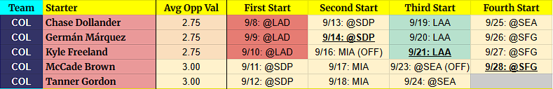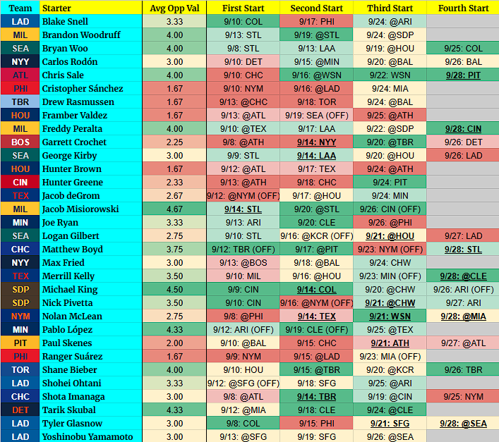 (OFF) = Team has an off-day before this start. For example, 9/5 BOS (OFF) = Team had an off day on 9/4.