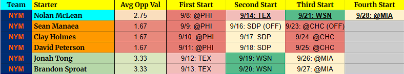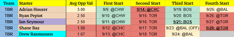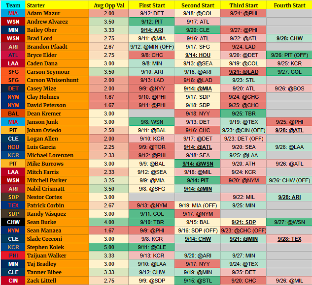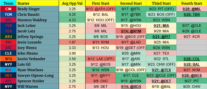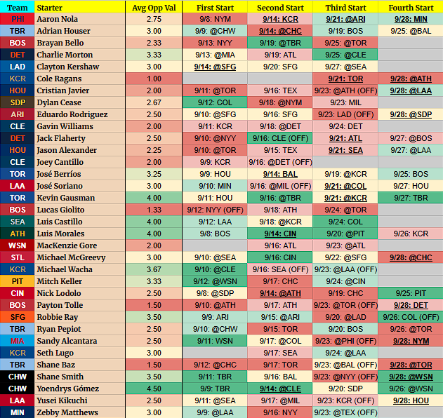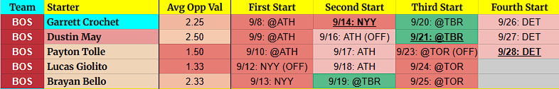 (OFF) = Team has an off-day before this start. For example, 9/5 BOS (OFF) = Team has an off day on 9/4.