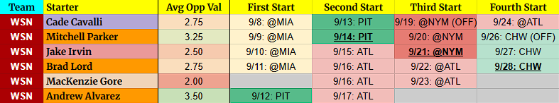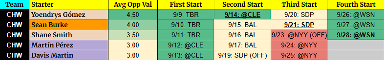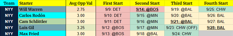Yoendrys Gómez – Gómez intrigues me and could be a final-weekend savior against the Nationals. 95 mph heaters with great shape (122 Fan4+ yesterday!) and two whiffable breakers. H*ck, he may be helpful this week, too.