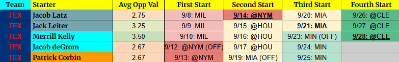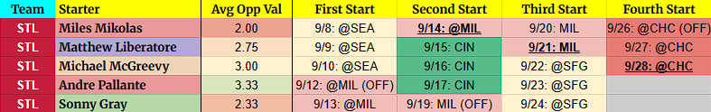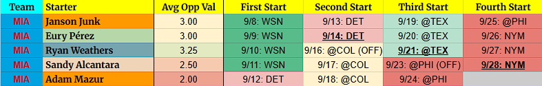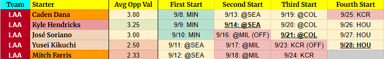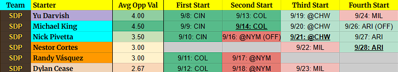 - Again, these tables are going to change. I’m trying to give a general idea of it, but injured pitchers returning, rainouts, bumped starters, callups, etc. mean the orders are all messed up. It happens, nothing I can do about it.