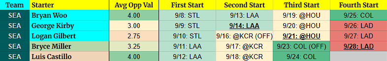 Bryce Miller – He was solid in the Still ILL, then a bit wonky against the Padres. It’s a strong schedule across September, fortunately, making him a hold. For now.