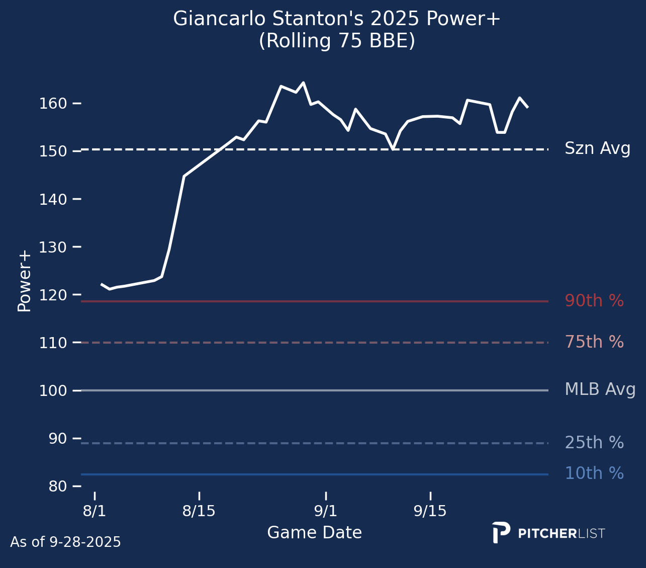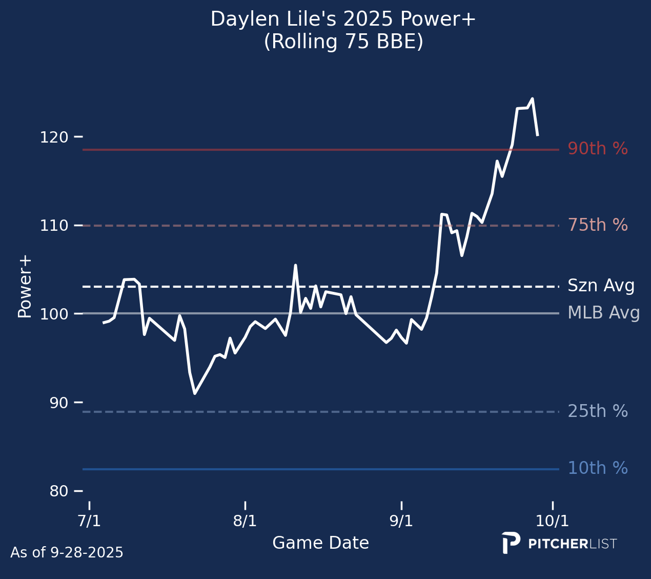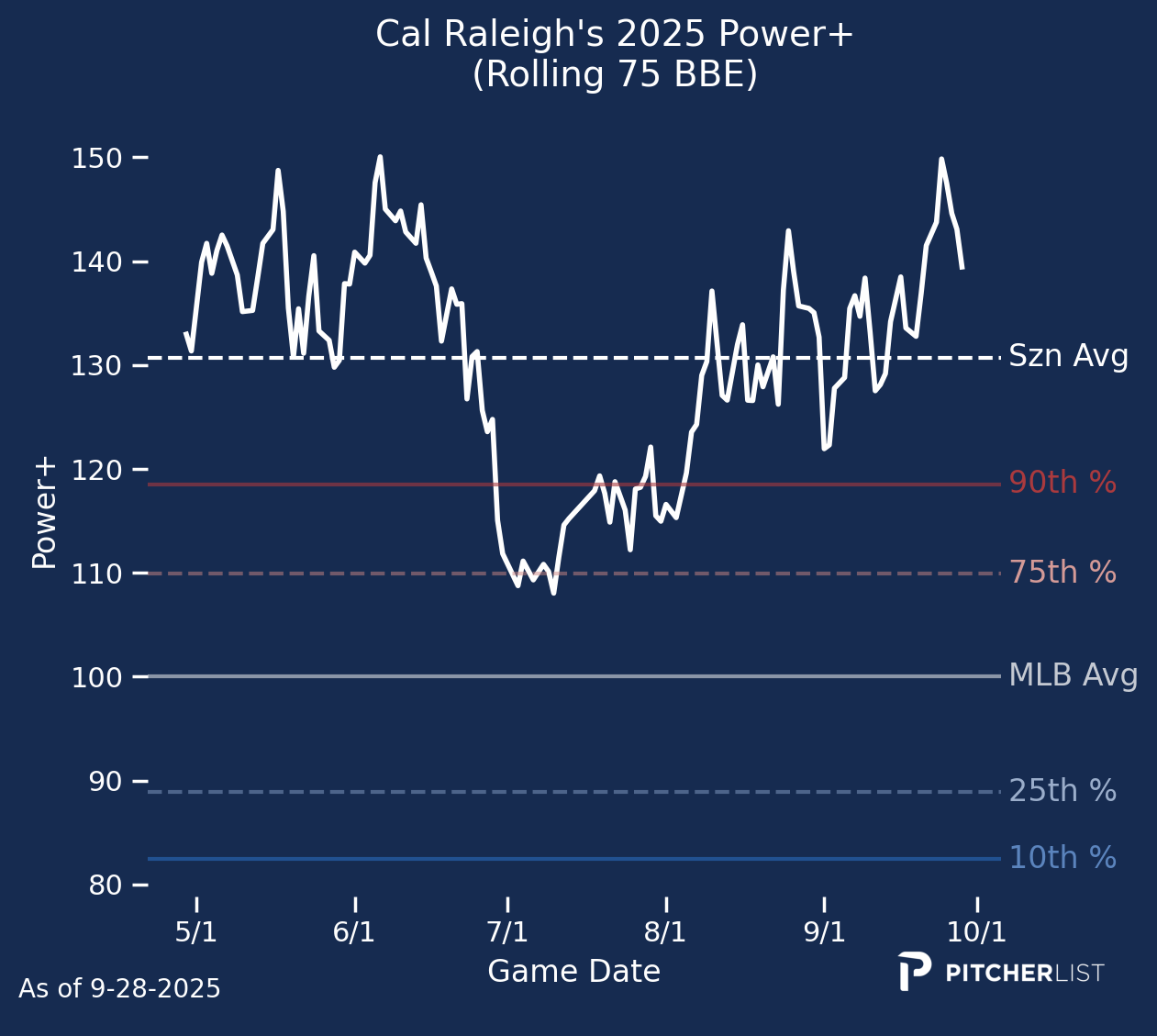 First and foremost, I hope you were able to pick up some useful information from my ramblings on the PLV Power Report this year. With that, we’ll wrap up the 2025 season by reviewing the top Power+ performers at each position. I’ll also pick a breakout player at each position next year. I should note that I’m not considering next year’s rookie class, but focusing on players whom we saw this season. Without further ado, let’s swing for the fences one last time.