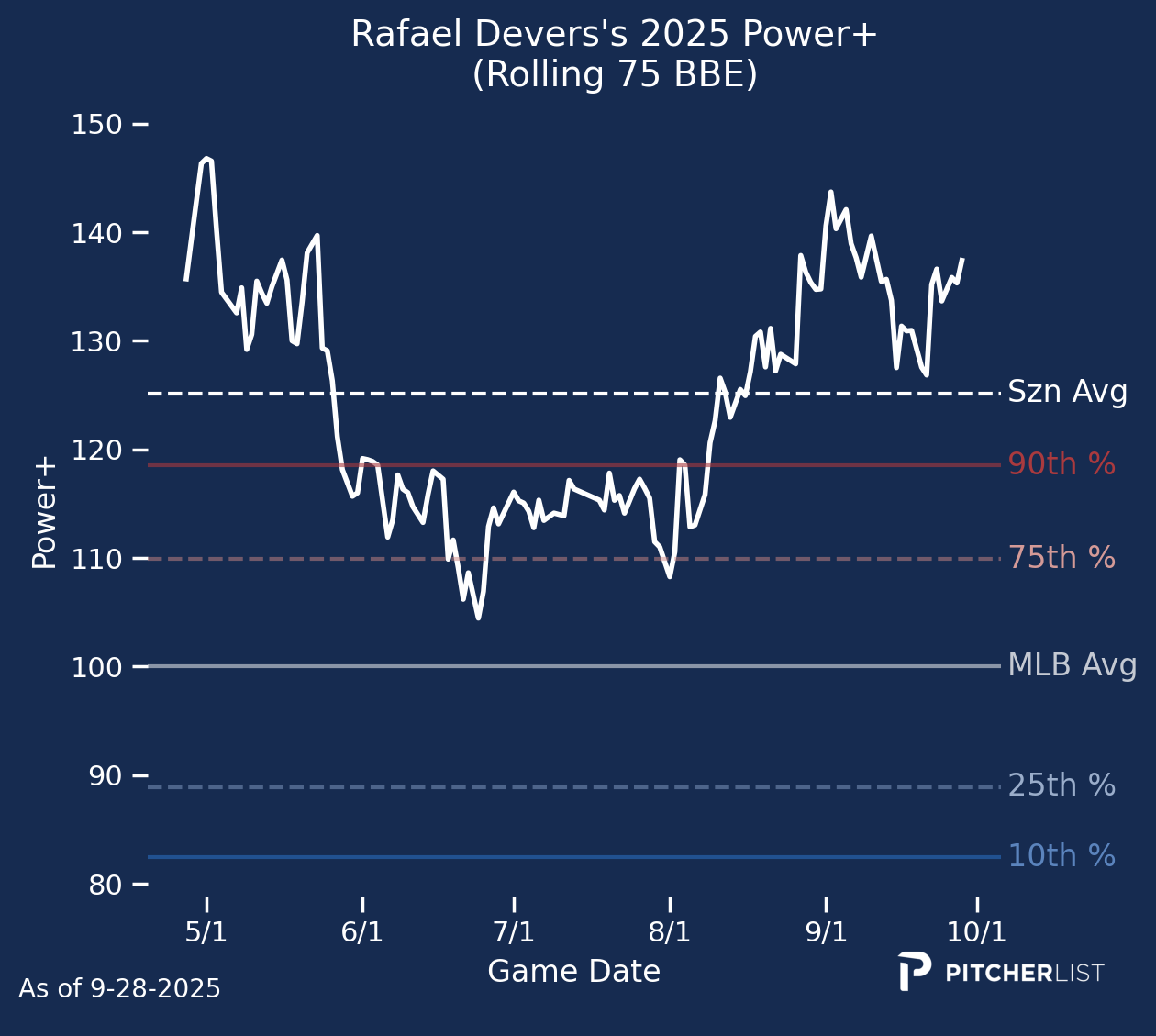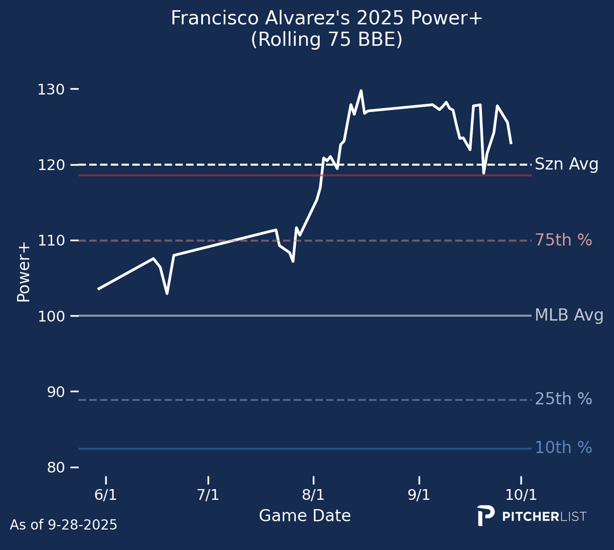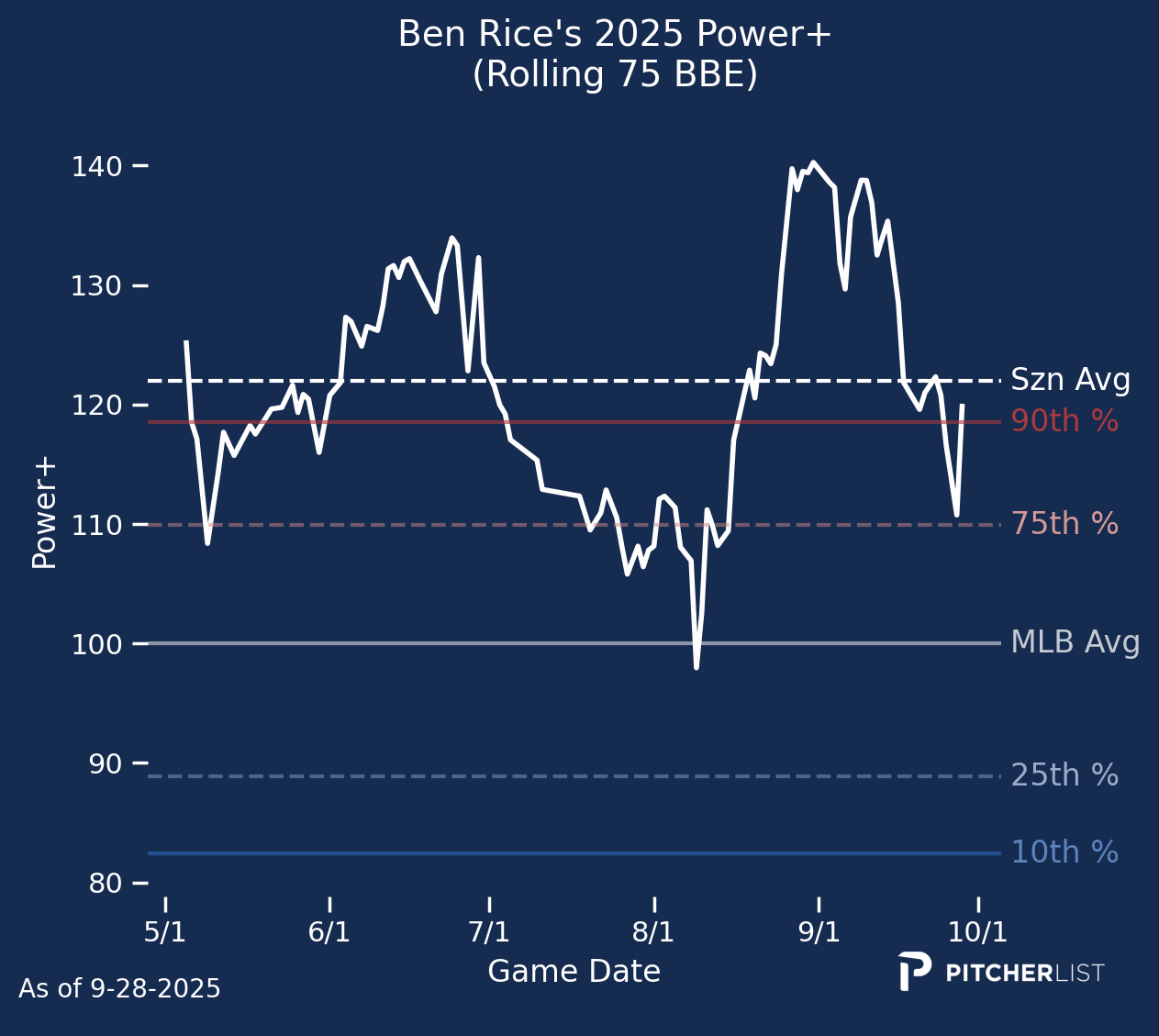 First and foremost, I hope you were able to pick up some useful information from my ramblings on the PLV Power Report this year. With that, we’ll wrap up the 2025 season by reviewing the top Power+ performers at each position. I’ll also pick a breakout player at each position next year. I should note that I’m not considering next year’s rookie class, but focusing on players whom we saw this season. Without further ado, let’s swing for the fences one last time.
