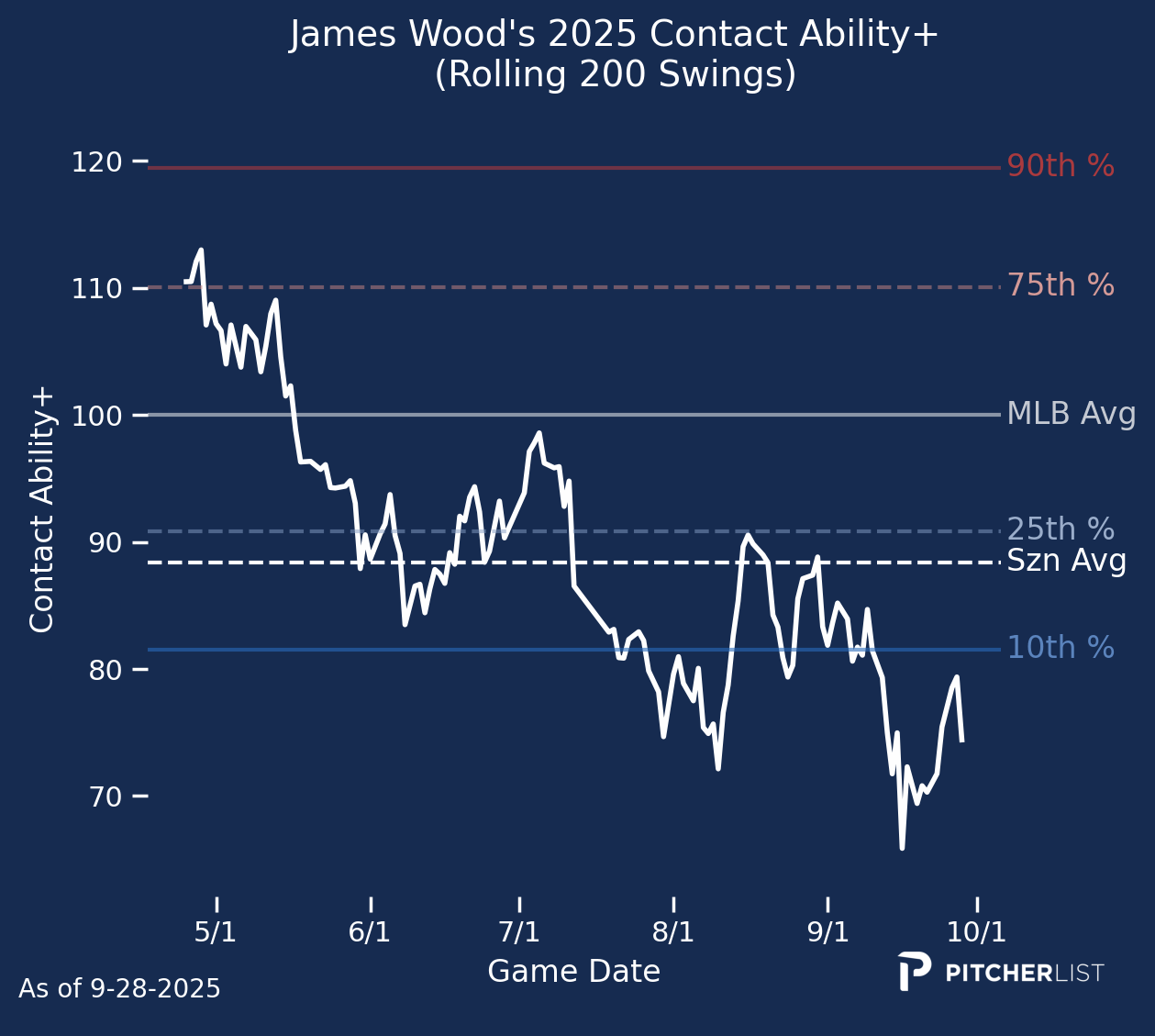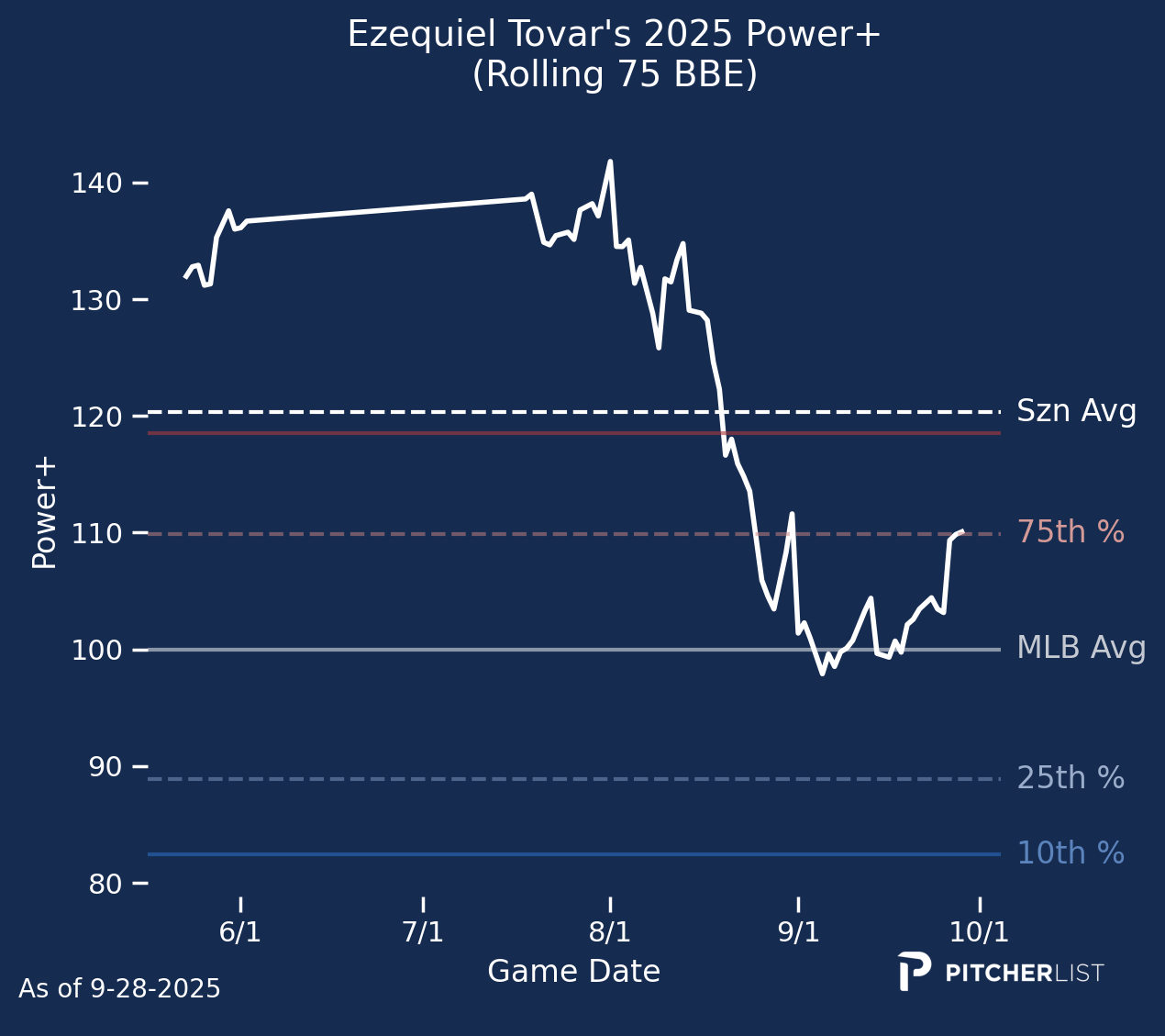 After banging 26 home runs in 2024, Ezequiel Tovar looked like an interesting gamble heading into year three. However, he hit just nine home runs in about half a season. The unexciting results and his being on the Rockies will send him tumbling down draft boards. However, Tovar’s 118 Power+ suggests better days ahead. As you can see, he flashed good power early, but faded late. He still has a ceiling worth going after.