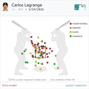 On Sunday, Lagrange battled through a challenging outing. He allowed plenty of hard contact and posted a below-average 57% strike rate. While the swing-and-miss was there at times, he generated just seven whiffs on the day. The encouraging takeaway: he didn’t issue a walk—a key stat fantasy managers will be watching closely all season.