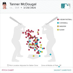 Matched up once again with Brody Hopkins, Tanner McDougal turned in the stronger box score in their Triple-A debuts. He racked up eight strikeouts on 16 whiffs, allowing just one earned run on two hits and four walks. The walks are the clear blemish, but they can largely be traced to an overreliance on his four-seamer as he struggled to command his breaking pitches. That approach nearly caught up to him in the third inning, when he put two runners in scoring position after surrendering two hits and two walks—but he escaped by dialing in the fastball at the right moment.