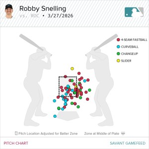 Even the strongest stallion needs to build up its gallop before breaking into a full sprint. Robby Snelling is off to a slow start after a mild opener for 2026. He managed to throw 66 pitches over four innings in an uneventful start. Unsurprisingly, the three strikeouts were on the fastball and curveball combination, despite a tick down in velocity.