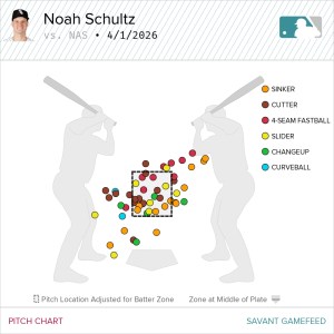 Make it two brilliantly efficient outings for Noah Schultz to start the 2026 season. A healthy knee is helping him to repeat consistent mechanics. Over these first two games, he has thrown at least 70% strikes and created matching pitch charts that have a diagonal array of dots. Furthermore, Schultz is bringing the heat, pumping 98 mph in the fifth inning of his latest game. With three fastballs, two breakers, and an offspeed changeup, he has developed a formidable 6-pitch arsenal to take down both sets of hitters. With pinpoint command across 93 pitches so far, he is demonstrating that he has enough savvy to make tough at-bats for all hitters.