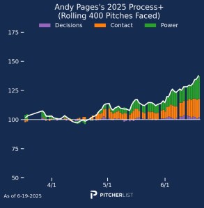With 80th percentile sprint speed, Pages is not only a power hitter but an overall elite athlete. That speed should help him keep his average up when his power goes through lulls, and his stolen bases should be expected to creep up as the year goes on and he gains more experience and confidence on the basepaths. Pages’ Process+ rolling chart also bears out the fact that he is more of a balanced hitter than ‘just’ a power hitter.