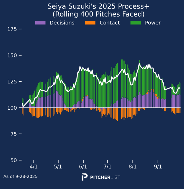 21. Seiya Suzuki (OF/DH, CHC) — Crow-Armstrong wasn’t the only Cubs hitter to have a hot start followed by a disappointing second-half, as Seiya Suzuki was the 16th-best hitter for fantasy in the first half per the FanGraphs Player Rater, thanks to a whopping 25 home runs and 77 RBI. Unfortunately, his second half was very pedestrian as he slashed .213/.336/.351 with just seven home runs (and five of those seven came in the last four games of the season, meaning many head-to-head managers did not get to benefit from them). Even with that bummer of a second half, Suzuki set or tied career highs in home runs (32), runs scored (75), and RBI (103). I don’t think there’s another gear in Suzuki’s bat in terms of power, but his .245 batting average was well below his norm, and there’s plenty of potential to see that number go up, which would also lead to better runs scored totals, likely a more consistent season.