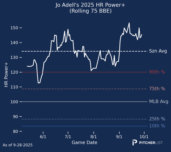 28. Kyle Stowers (OF, MIA) — Stowers was one of the best hitters in baseball back in July, smacking 10 home runs in 24 games and slashing .364/.451/.818 with an impressive blend of discipline, contact, and power. There’s no question that Stowers has the thump to slug over .500 for a season, but issues with contact in the zone and strikeouts have popped up over his short career, and those issues often spell volatility for power hitters. If he maintains the double-digit walk rate we saw in 2025 and keeps that zone contact rate north of 80% more often than he doesn’t, this is a guy who can hit .260-.270 with 30-35 home runs. If he can’t do those things, he’s more like a 30-35 home run guy that hits .220-.230.
