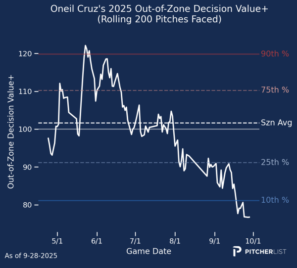 12. Pete Crow-Armstrong (OF, CHC) — It was a tale of two halves for Pete Crow-Armstrong, going from one of the best hitters in the game through July to one of the worst from August to the end of the season. Oddly enough, plate discipline didn’t seem to play a massive role in his demise, as his second-half strikeout rate of 25.6% wasn’t that much higher than it was in the first half (22.9%).