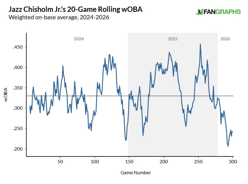 - Jazz Chisholm Jr. Jr. is a streaky hitter by nature, and while this streak is just a hair worse than any he’s had the last few years, it’s worth noting that he has shown that he can heat up in a hurry. With the state of second base being what it is, it might be worth trying to buy low from someone who can’t get over the blue bars on his Statcast page (it’s ugly because he’s popping out a ton, but he’ll adjust and those popups will revert to regular fly balls soon enough).