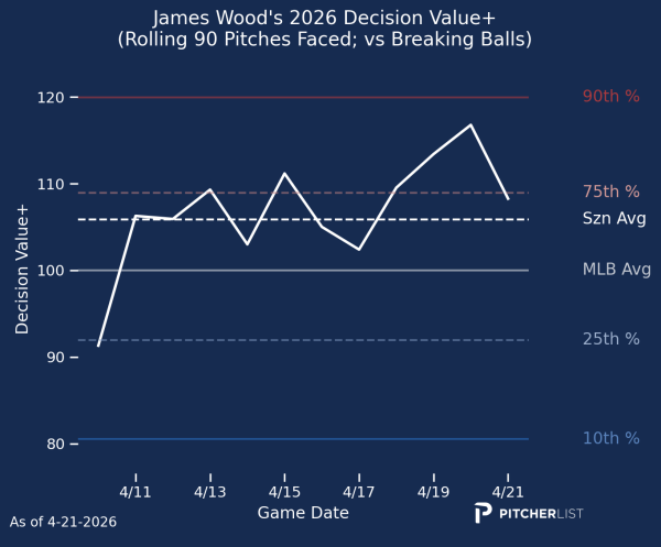 - James Wood moves up a little higher, and the big story for me so far is a rebound in his decision-making against breakers. As long as he can just be average at swing decisions against breaking balls, that top-10 upside is in reach.