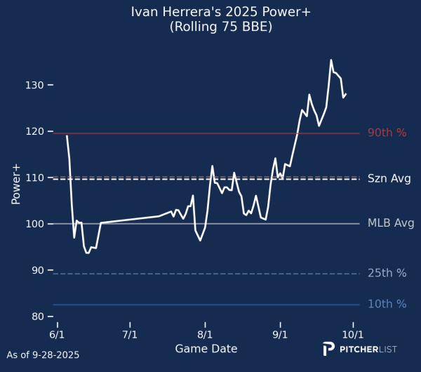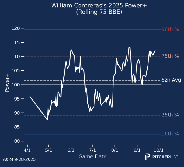 5. William Contreras (C/DH, MIL) — Contreras dealt with an injury in his left hand all season, though he looked a bit more like his old self as the season wore on (as you can see below in the rolling Power chart). It’s not easy to determine precisely how much this sort of injury impacted a hitter, but even with the injury, Contreras finished as a top-five catcher and as a top-40 hitter, so it feels silly to rank him any lower than that heading into what will presumably be a healthy 2026. Despite his power, Contreras has never hit more than 23 home runs due to his high ground-ball and low fly-ball rates, though he did make some improvements in that regard in 2025 (they turned into liners instead of fly balls, though, so it may have merely been a bit of a fluke).
