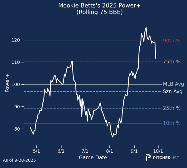 7. Mookie Betts (SS, LAD) — Through his first 453 plate appearances of 2025 (103 games), Mookie Betts was objectively a disappointment. He was slashing just .231/.302/.355 with just 11 home runs, and for quite some time, we openly questioned whether Betts was in the twilight of his career. He must have heard us, because for the remaining 47 games, he hit nine home runs with a fantastic .317/.376/.516 line. Our metrics certainly caught this spike as well.