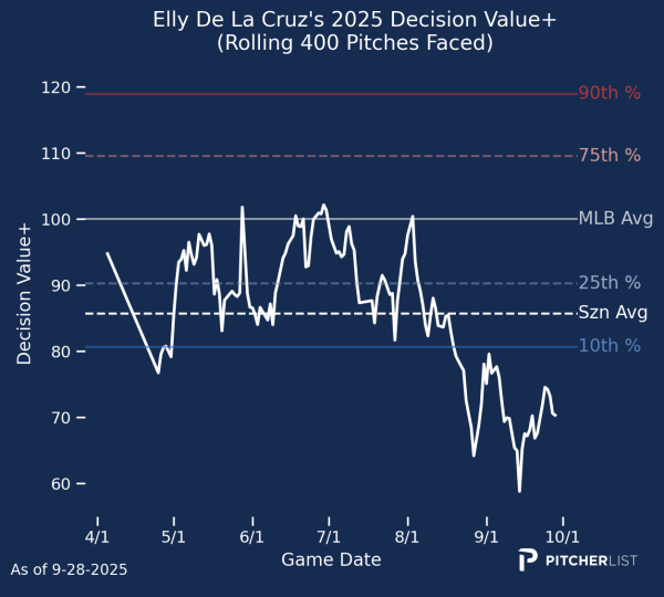 4. Elly De La Cruz (SS, CIN) — The Reds were far less aggressive on the base paths in 2025 than in 2024 (when they were one of the most aggressive teams in the league) under Terry Francona, and it’s hard to imagine that changing too much in 2026. That puts a lower ceiling on the steals, though the rest of the package is as promising as ever. Elly will likely never be an elite decision-maker, but if he can just be below average like he was in the first half instead of abysmal like he was in the second half, there’s a chance he’s at the top of this tier early into 2026. The more likely outcome, though, is more of the rollercoaster ride we’ve seen from him throughout his career so far, albeit with a bit higher floor thanks to the reduced strikeout rate.