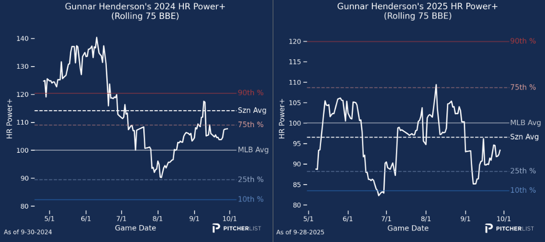 3. Gunnar Henderson (SS/DH, BAL) — One of the most frustrating things about trying to evaluate players in-season is that we just don’t know everything that’s going on. Earlier in January, Henderson admitted that he played with a shoulder issue for most of the season, which may very well explain the 4.2 drop in his average fly ball velocity in 2025. That’s why he jumped from 28th in my “too early” rankings from October to 16th today. It is worth noting, though, that the power outage we saw really started in the second half of 2024 (see charts below), and there’s still risk that he won’t get back to the 30+ home run guy we fell in love with in 2024. Still, with an improved lineup around him and a boatload of talent, Henderson is well worth the gamble.
