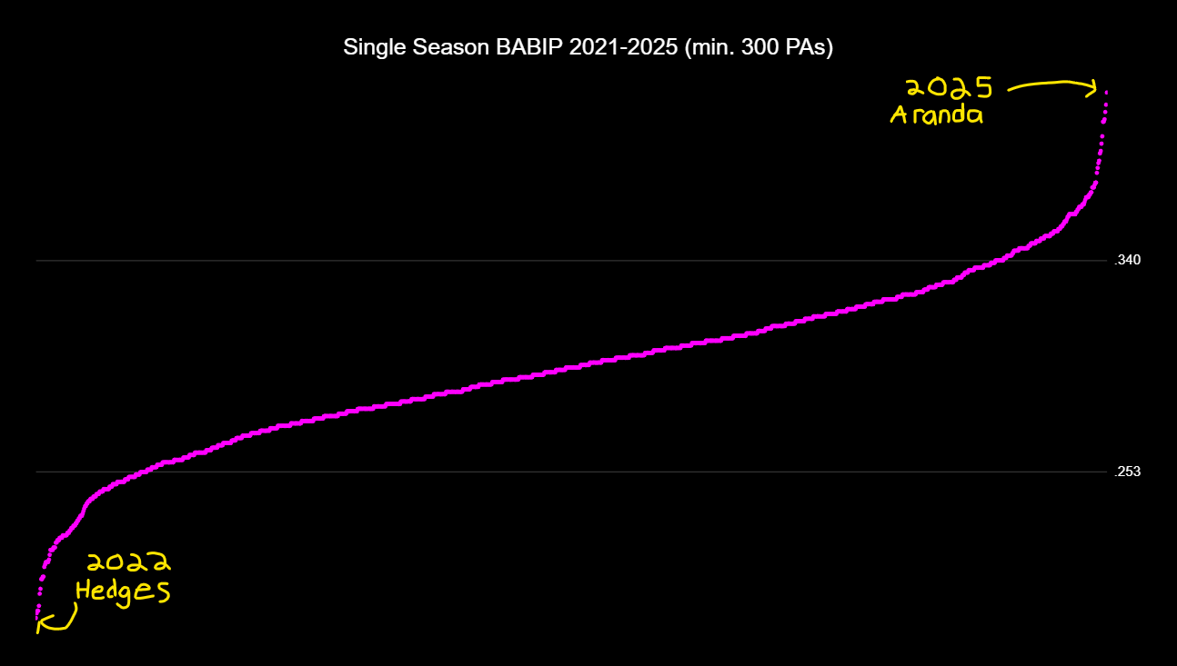 It’s awful! His career BABIP is .227. This is because Austin Hedges does almost none of the things that are good for BABIP. Jonathan Aranda, on the other hand, does a lot of things that contribute to a high BABIP. Part 1 and Part 2 looked at pitchers and everything that went into BABIP. Parts 3 (that’s this one!) and 4 will look at the other side of the ball, and everything that goes into a hitter’s BABIP. So let’s start with the (should be) obvious: